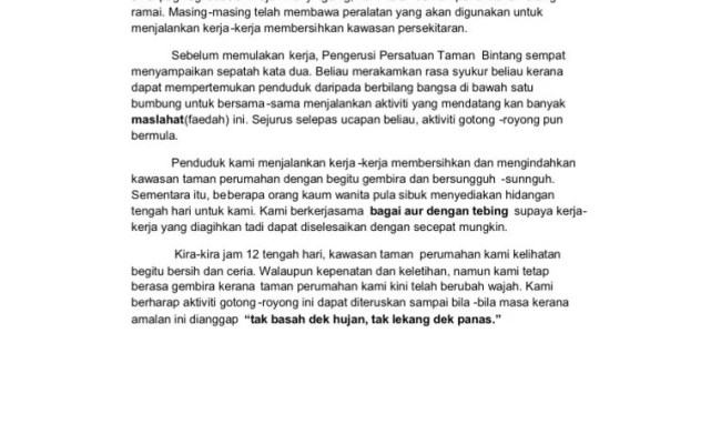 Apabila pembahagian tugas dilakukan, ia akan dapat membuatkan semua orang merasai semangat bersatu padu. Karangan kebaikan gotong royong spm. Mereka akan menyedari kepentingan dan faedah kemudahan awam kepada masyarakat.